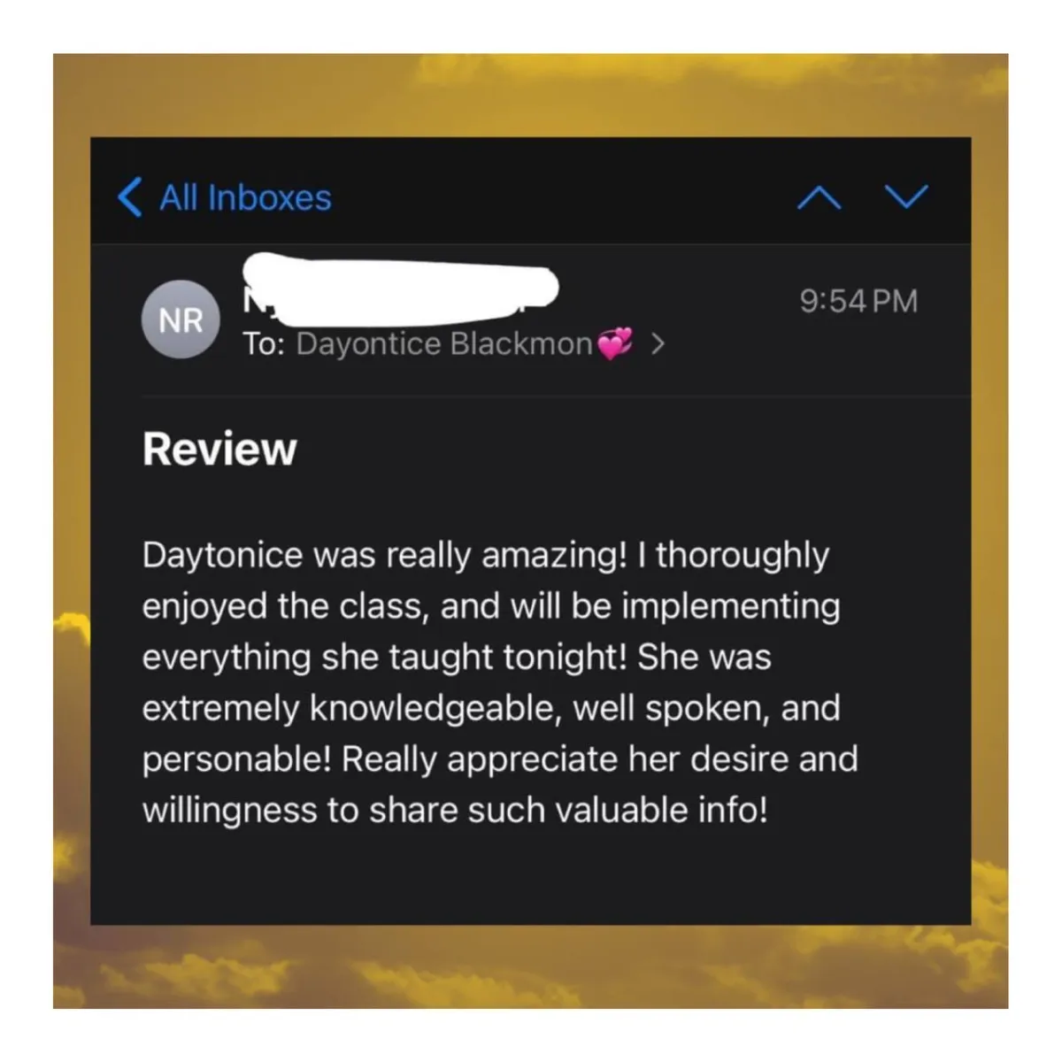 We do not make any earnings claims or guarantee that our training will make you any money. All material presented is the intellectual property of Dayontice Blackmon and protected by copyright. Any duplication, reproduction, or distribution is strictly prohibited.